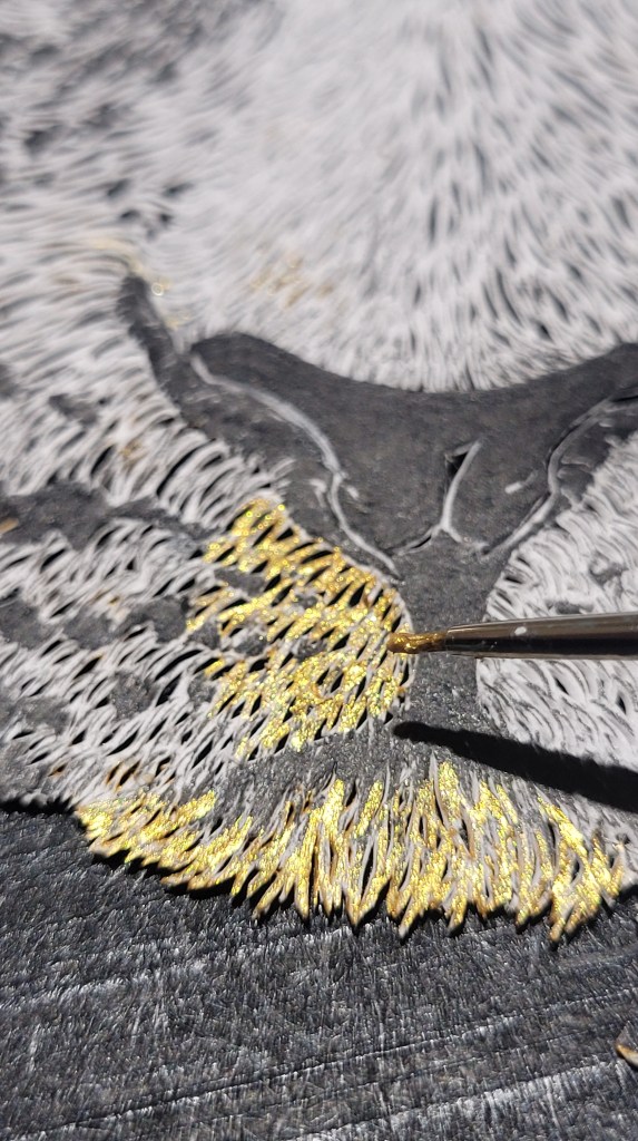 La peinture est une phase assez longue, qui demande également beaucoup de patience. A chaque coup de pinceau, il faut faire attention à ne pas reboucher les milliers et minuscules petits trous.