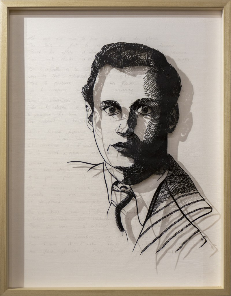 Après sa mort, ses amis ont pu découvrir ou redécouvrir ses manuscrits ; des proses inachevées ; des idées raturées ; des longs essais qu’il avait écrit sur des cahiers d’écolier. En prenant le temps d’observer le tableau, vous découvrirez justement des strophes écrites en gris clair.
